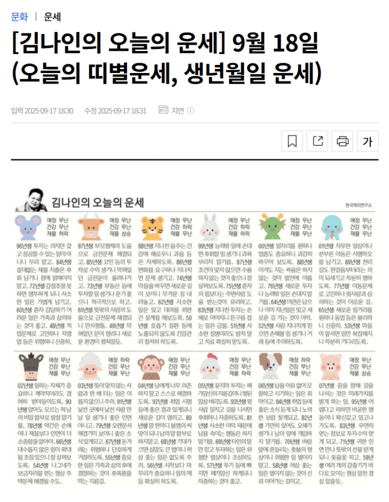 4. 기사 상세 페이지로 이동하면 신문 지면을 그대로 옮겨놓은 듯한 익숙한 형태의 운세 풀이를 만날 수 있어요. 띠별, 생년월일별로 상세하게 나뉘어 있어 나에게 해당하는 내용을 찾아 읽기 편리합니다.