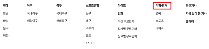 2. 펼쳐진 전체 메뉴에서 연예, 스포츠 등 여러 분야 중 '기획·연재' 항목을 찾아 들어가면 꾸준히 연재되는 특별한 이야기들을 만나볼 수 있습니다.
