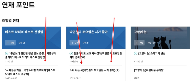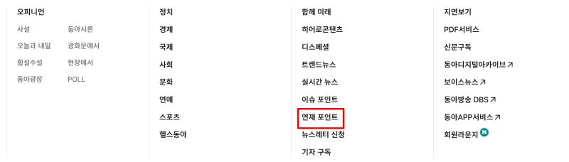 3. '연재 포인트'는 동아일보에서 꾸준히 발행되는 다양한 시리즈를 한데 모아 놓은 공간이에요. 건강, 시사, 문화 등 여러 주제의 연재물들을 요일별, 최신순으로 만나볼 수 있습니다.