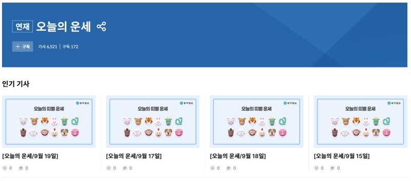 5. '오늘의 운세' 시리즈 페이지로 이동하면 가장 인기 있는 기사들과 함께 전체 운세 목록을 볼 수 있어요. 이곳에서 오늘 날짜나 확인하고 싶은 날짜의 운세를 찾아볼 수 있습니다.