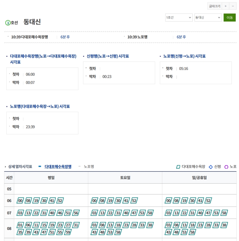 8. 특정 역을 조회하면 첫차와 막차 시간은 물론, 평일, 토요일, 공휴일로 나누어진 상세한 시간표가 나타나 스케줄에 맞춰 편리하게 이용할 수 있습니다.