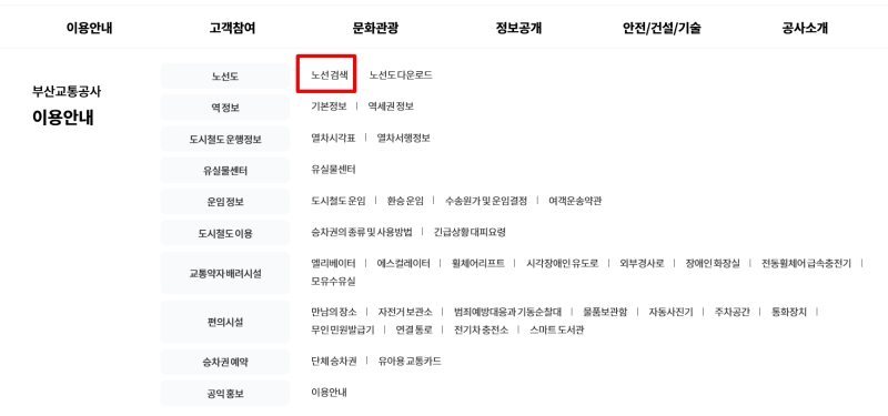2. '이용안내'로 들어가면 다양한 하위 목록이 나타납니다. 여기서 '노선도'를 찾아 들어가면 전체 노선 현황을 파악할 수 있는 페이지로 연결됩니다.