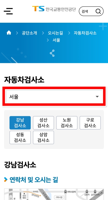 3. 검사소 찾기 페이지로 이동하면, 가장 먼저 지역을 선택하는 화면이 나와요. 기본적으로 '서울'이 선택되어 있고, 그 아래로 강남, 성산, 노원 등 서울 시내의 검사소 목록이 보여요.