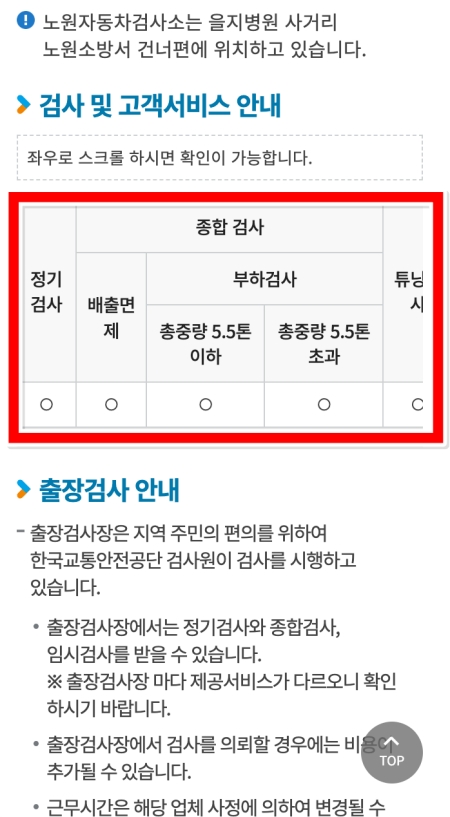 7. 아래로 화면을 조금 내리면, 해당 검사소에서 어떤 종류의 검사(정기검사, 종합검사, 튜닝검사 등)를 받을 수 있는지 표로 정리되어 있어서 미리 확인하기 좋아요.