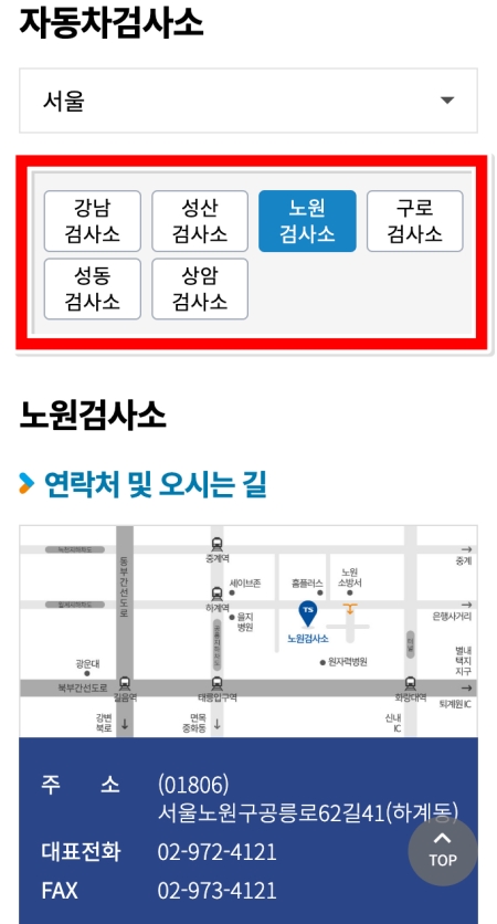 5. 지역을 선택하면 해당 지역에 있는 검사소 목록이 버튼 형식으로 나타나요. 여기서 내가 방문하고 싶은 검사소(예: 노원검사소)를 선택해 주세요.