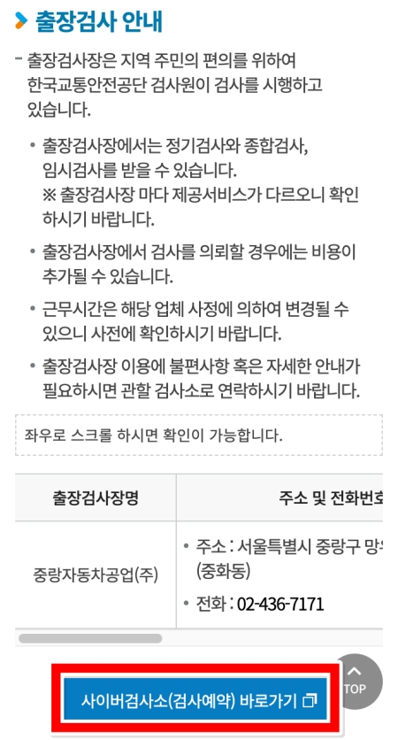 8. 출장검사 서비스에 대한 안내도 확인할 수 있고, 맨 아래 '사이버검사소(검사예약) 바로가기' 버튼을 누르면 온라인으로 간편하게 검사 예약을 진행할 수도 있답니다.