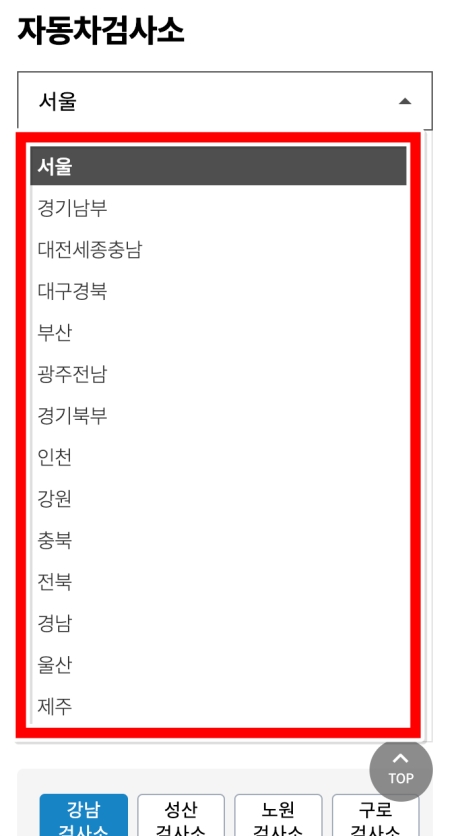 4. 내가 사는 지역을 찾기 위해 지역 선택창을 눌러보세요. 서울부터 제주까지 전국의 모든 검사소 관할 지역이 목록으로 나타나니, 본인이 거주하는 지역을 선택하면 됩니다.