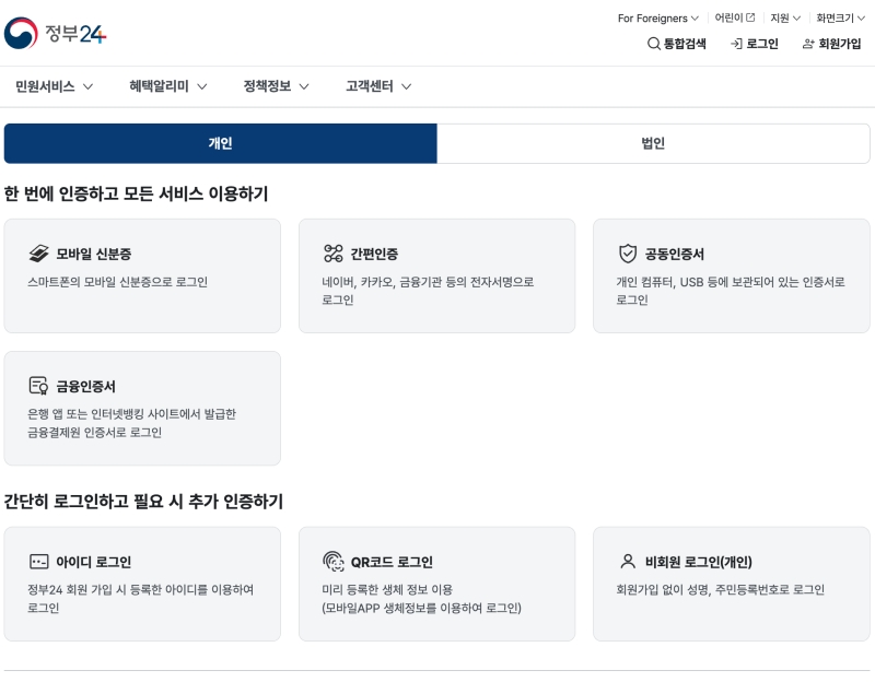 4. 민원 신청을 위해서는 로그인이 필수예요. 공동인증서(구 공인인증서)나 간편인증(카카오, 네이버 등)처럼 본인이 사용하기 편한 방법으로 인증을 완료해 주세요.