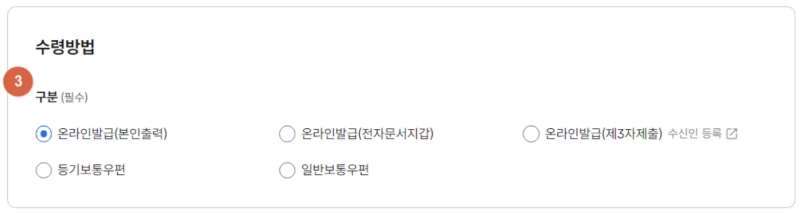 6. 마지막으로 서류를 어떻게 받을지 '수령방법'을 선택하는 단계예요. 집에서 바로 프린터로 출력하고 싶다면 '온라인발급(본인출력)'을 선택한 뒤 민원신청을 완료하면 됩니다.