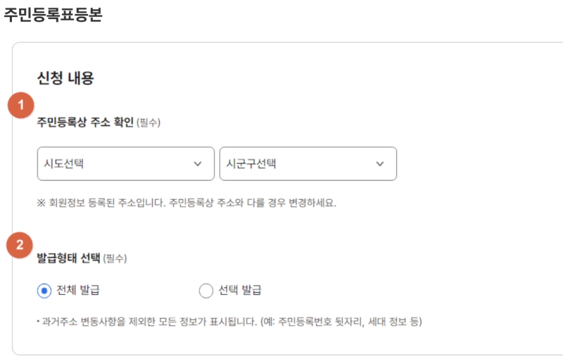 5. 로그인 후 신청 화면이 나오면, 먼저 본인의 주소를 확인하고 어떤 내용을 포함할지 '발급 형태(전체/선택 발급)'를 선택해 주세요. 모든 정보가 필요하면 '전체 발급'을 누르면 돼요.