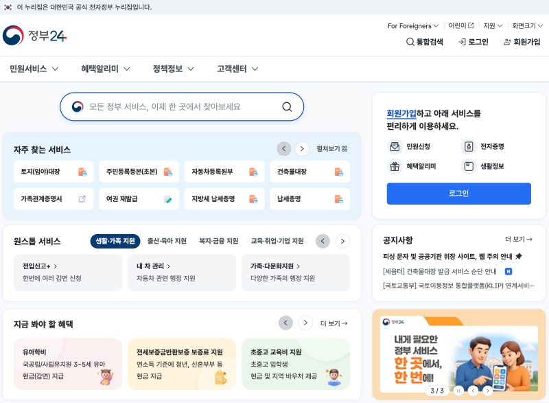 1. 대한민국 정부 대표 포털인 '정부24' 홈페이지에 접속해서, 메인 화면 중앙에 있는 검색창을 이용해 주세요.