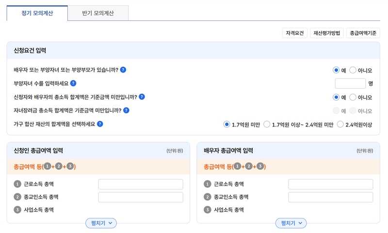 3. 모의계산 화면으로 넘어가면 가구원 구성, 소득 정보 등을 입력하는 칸이 나옵니다. 본인과 배우자의 총급여액 등 필요한 정보를 정확하게 기입해야 좀 더 신뢰도 높은 결과를 얻을 수 있습니다.