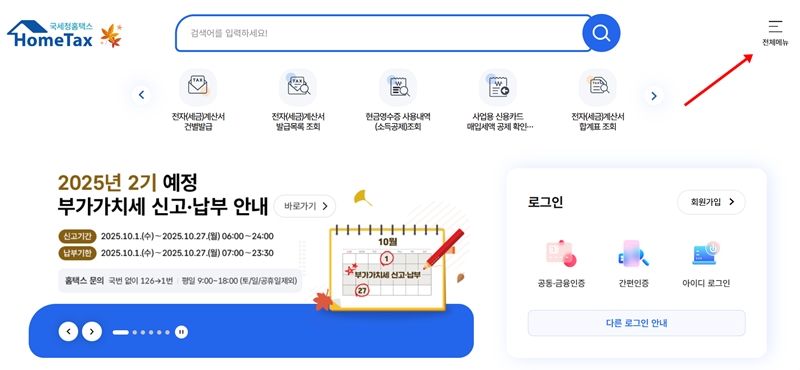 1. 국세청 홈택스 홈페이지에 접속한 뒤, 오른쪽 위에 위치한 '전체메뉴'를 선택하면 모든 세금 관련 서비스를 한눈에 볼 수 있도록 화면이 펼쳐집니다.