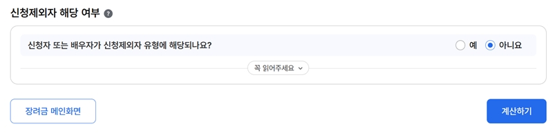 4. 모든 정보를 입력하고 신청 제외 요건에 해당하지 않는지 확인한 후, 화면 아래에 있는 '계산하기'를 누르면 예상 장려금 액수를 미리 확인해 볼 수 있어 편리합니다.
