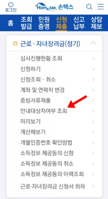 6. '신청·제출' 화면 안에서 '근로·자녀장려금(정기)' 항목을 찾고, 그 아래에 있는 '안내대상자여부 조회'를 통해 내가 올해 신청 안내를 받은 대상인지 직접 알아볼 수 있습니다.