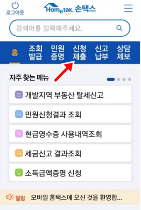 5. 스마트폰을 이용할 경우에는 홈택스 모바일 앱인 '손택스'를 활용하면 편리합니다. 앱을 실행한 후 메인 화면에 보이는 여러 메뉴 중 '신청·제출'을 선택하여 들어갑니다.