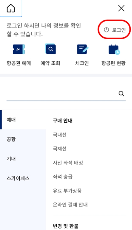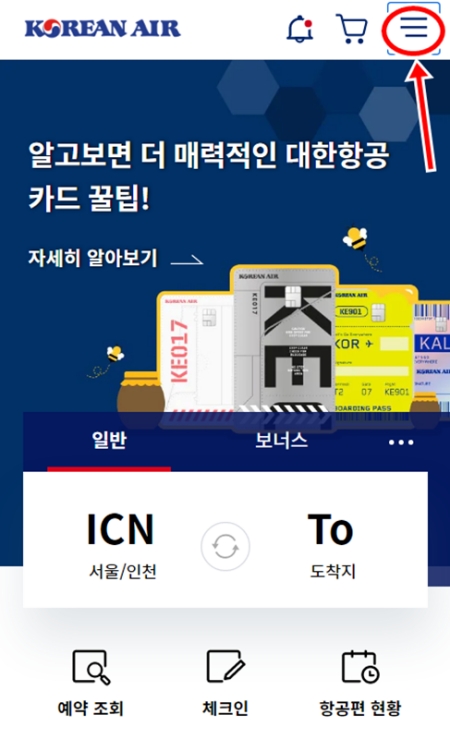1. 대한항공 모바일 앱이나 홈페이지에 접속했다면, 먼저 오른쪽 위에 있는 석 삼(三) 모양의 전체 메뉴를 열어주세요. 다양한 서비스로 이동할 수 있는 시작점입니다.