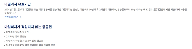 11. 마일리지는 탑승일로부터 10년의 유효기간이 있으며, 마일리지로 구매한 보너스 항공권이나 일부 할인 항공권 등은 마일리지가 적립되지 않으니 이 점도 꼭 기억해주세요.