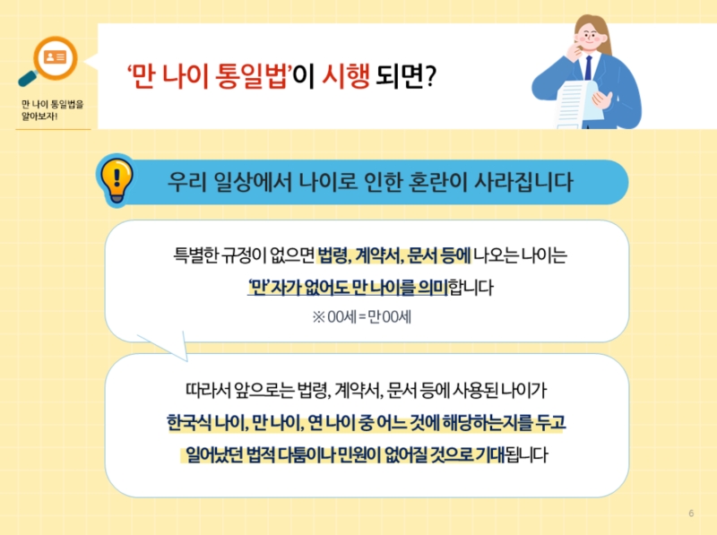 6. '만 나이 통일법'이 시행됨에 따라 앞으로 법령, 계약, 공문서 등에서 사용되는 나이는 특별한 규정이 없는 한 '만'이라는 글자가 없어도 만 나이를 의미하게 되어 혼선이 사라질 것으로 기대됩니다.