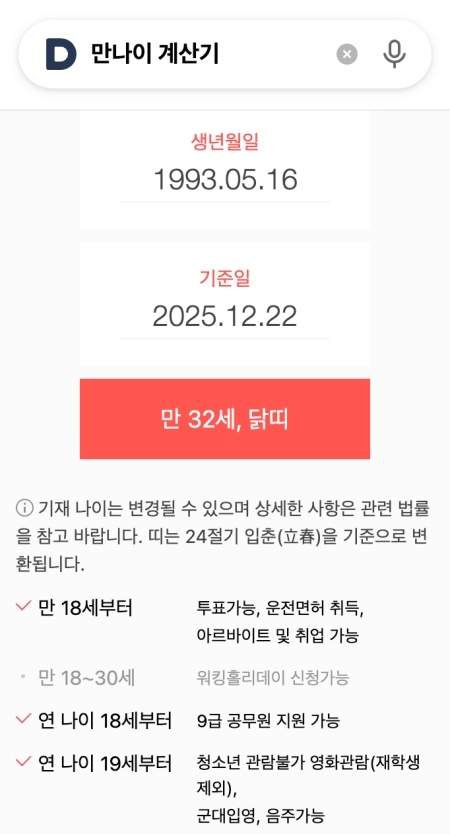 5. 예를 들어, 1993년 5월 16일에 태어난 사람이 2025년 12월 22일을 기준으로 자신의 나이를 계산하면, 생일이 이미 지났으므로 만 32세가 되는 것을 결과로 보여줍니다.
