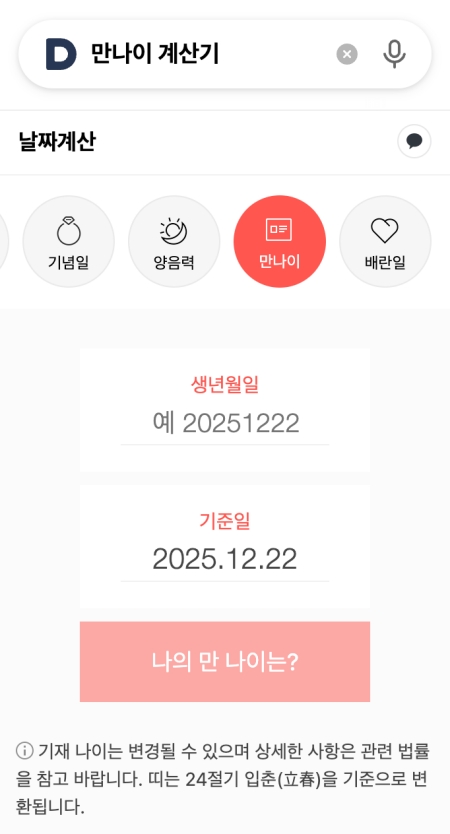 4. 직접 계산하는 것이 번거롭다면 포털 사이트에서 제공하는 '만 나이 계산기'를 이용하면 편리합니다. 생년월일과 기준일을 입력하면 자신의 정확한 만 나이를 바로 확인할 수 있습니다.