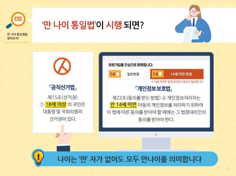7. 이미 '공직선거법'의 선거권(만 18세 이상)이나 '개인정보보호법'의 아동 개인정보 동의 기준(만 14세 미만) 등 여러 법령에서 만 나이는 중요한 기준으로 사용되고 있습니다.