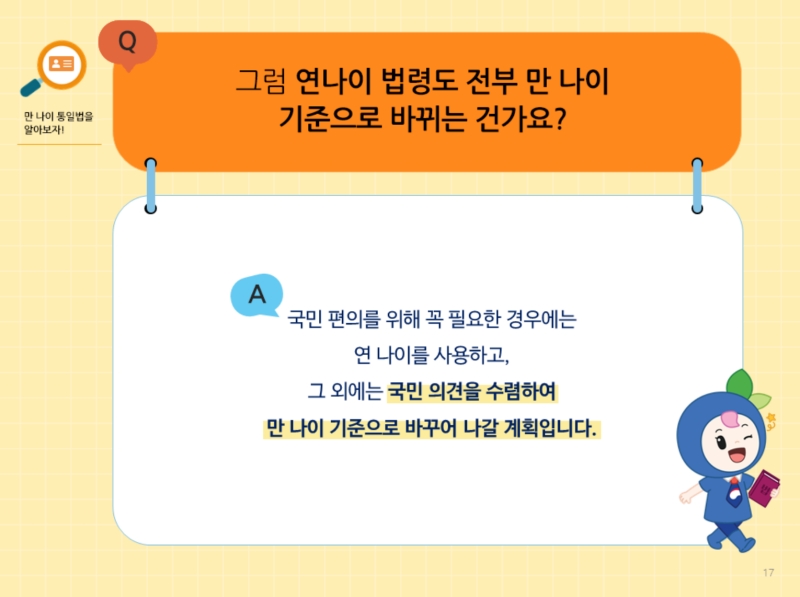 9. 이처럼 '연 나이'는 국민 편의를 위해 꼭 필요한 경우에 한해 사용되며, 그 외에는 국민 의견을 수렴하여 점차 만 나이 기준으로 바꾸어 나갈 계획이라고 합니다.