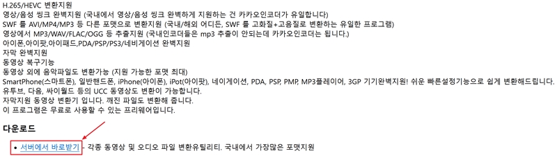 1. 카카오인코더를 내려받기 위해 공식 홈페이지에 방문하면 프로그램에 대한 설명과 함께 '다운로드' 항목을 찾을 수 있습니다. 여기서 '서버에서 바로받기'를 선택하여 설치 파일을 컴퓨터에 저장해주세요.