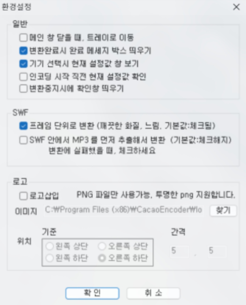 7. 우측 상단의 '환경설정'으로 들어가면 더 세부적인 항목을 조절할 수 있습니다. 변환 완료 메시지를 띄우거나, 영상에 로고를 추가하는 등 자신의 작업 환경에 맞게 변경이 가능합니다.