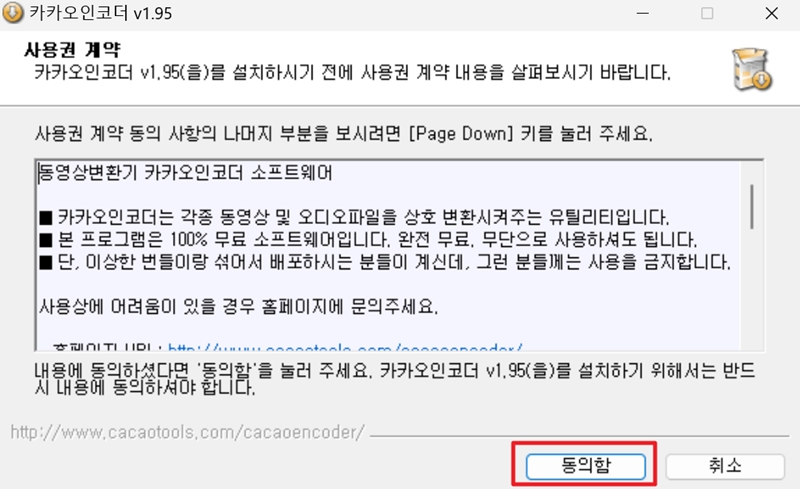 2. 내려받은 설치 파일을 실행하면 가장 먼저 사용권 계약 창이 나타납니다. 카카오인코더는 무료로 사용할 수 있는 소프트웨어라는 내용 등을 확인한 후, 계속 진행을 위해 '동의함'을 눌러줍니다.