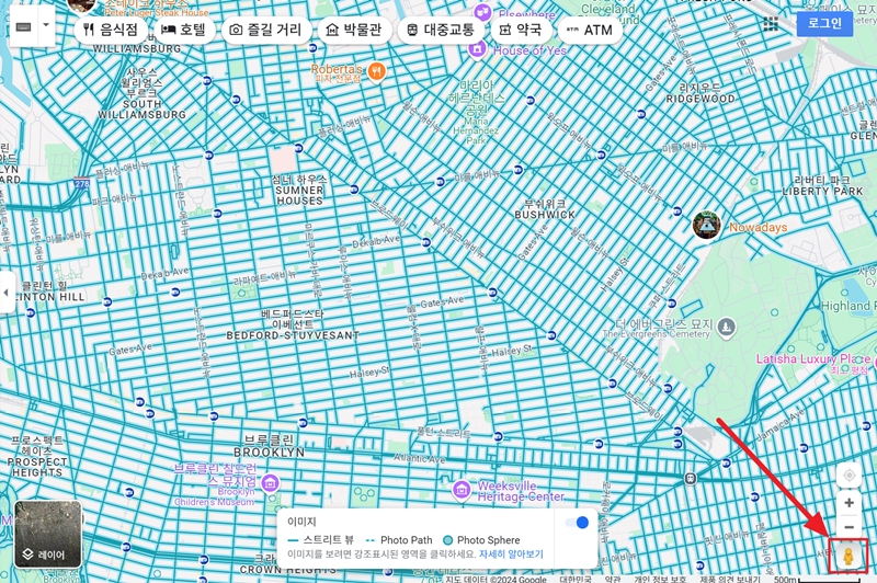7. 지도를 확대하여 거리 수준으로 가까이 갔을 때, 화면 오른쪽 아래에 있는 노란색 사람 모양의 아이콘을 이용하면 '스트리트 뷰' 기능을 활성화할 수 있습니다.