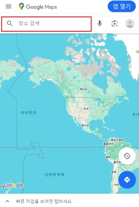 1. 구글 지도를 실행하면 가장 먼저 보이는 것은 세계 지도와 상단의 '장소 검색' 창입니다. 우리가 원하는 지역의 정보를 얻기 위한 첫걸음은 바로 이 검색창을 이용하는 것입니다.