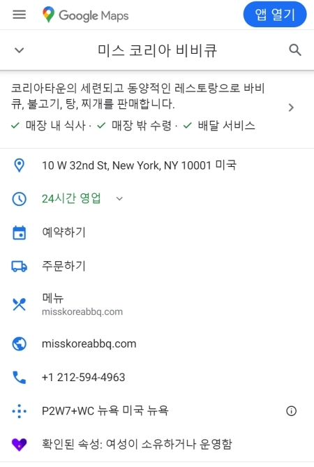 6. 심지어 '미스 코리아 비비큐'처럼 현지에 있는 한식당 같은 특정 상점의 정보도 얻을 수 있습니다. 정확한 주소, 영업시간, 연락처 등 방문에 필요한 구체적인 내용을 알려줍니다.
