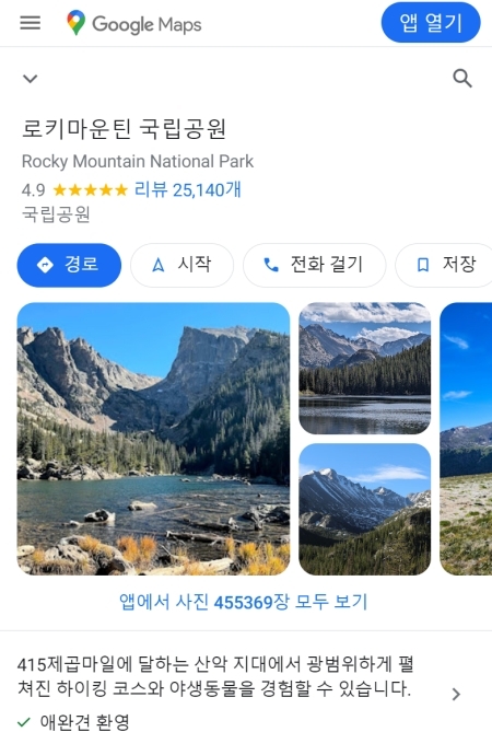 5. '로키마운틴 국립공원' 같은 유명 관광 명소를 검색하는 것도 가능합니다. 방문객들의 리뷰나 평점, 멋진 사진들을 미리 보며 여행 계획에 참고할 수 있어 아주 유용합니다.