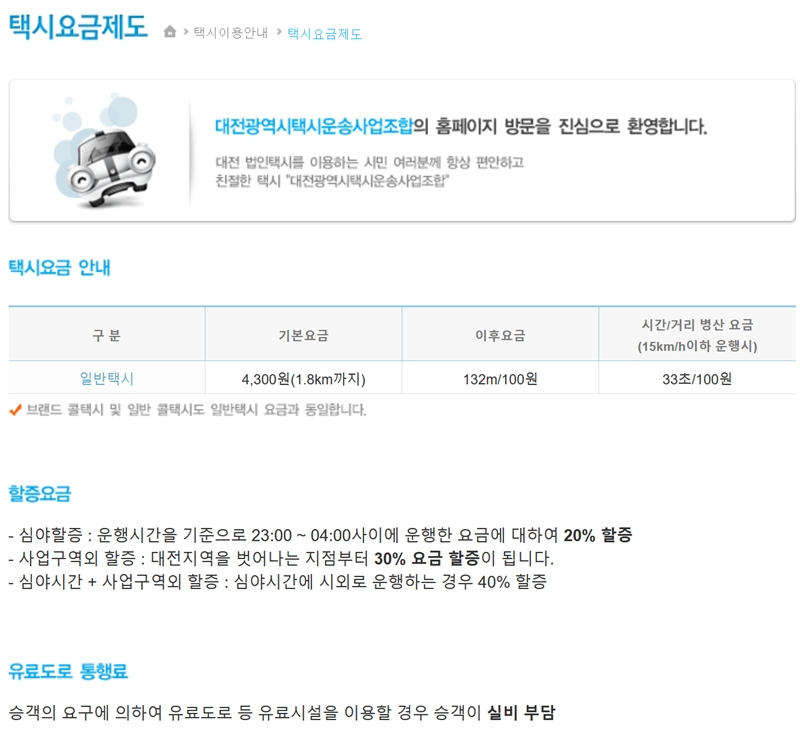 1. 대전광역시택시운송사업조합 홈페이지의 상단 메뉴 중 '택시이용안내'를 살펴보면, 브랜드 콜택시 정보와 함께 현재의 택시 요금 제도, 그리고 과거 요금 변동 현황까지 상세히 알아볼 수 있습니다.