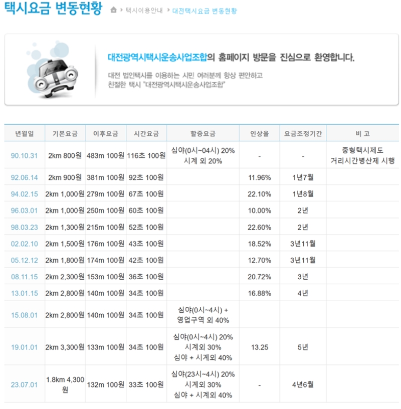 3. 홈페이지의 '택시요금 변동현황'을 통해 과거 요금 기록을 확인할 수 있는데요. 현재의 요금 체계는 2023년 7월 1일부터 적용되었음을 알 수 있으며, 역대 요금 인상률과 조정 기간 등도 참고할 수 있습니다.