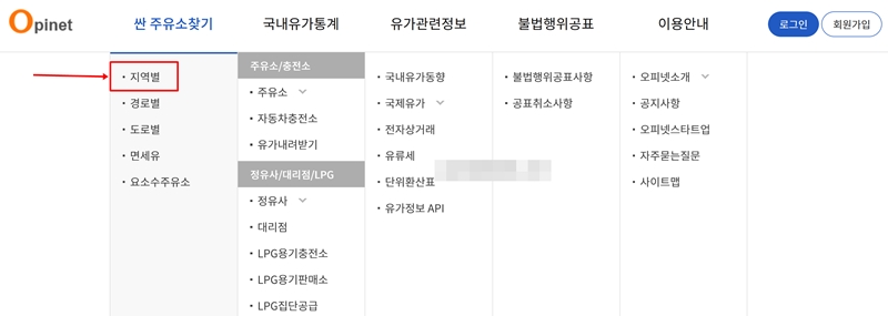 1. 오피넷 홈페이지에 접속하면 상단 메뉴에 '싼 주유소찾기'가 있습니다. 이곳에 마우스를 가져가면 '지역별', '경로별' 등 다양한 검색 방식이 나타나는데, 특정 동네의 주유소를 찾기 위해 '지역별'을 선택합니다.