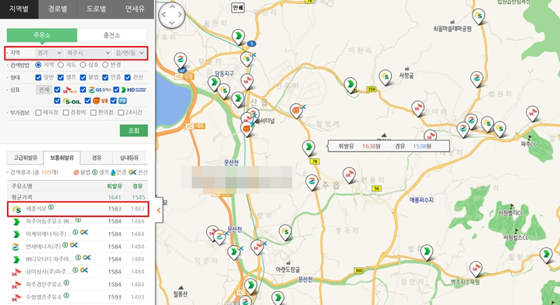 2. 지역별 검색 화면으로 이동하면 지도와 함께 상세 검색창이 나타납니다. 원하는 시/도와 시/군/구를 차례대로 선택하면, 해당 지역의 주유소들이 가격순으로 정렬된 목록과 함께 지도 위에 표시됩니다.