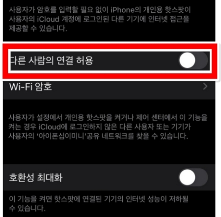 7. 마지막으로 '다른 사람의 연결 허용' 오른쪽에 있는 스위치를 켜주면 모든 준비가 끝납니다. 이제 다른 기기에서 와이파이를 검색해 내 아이폰에 접속할 수 있습니다.