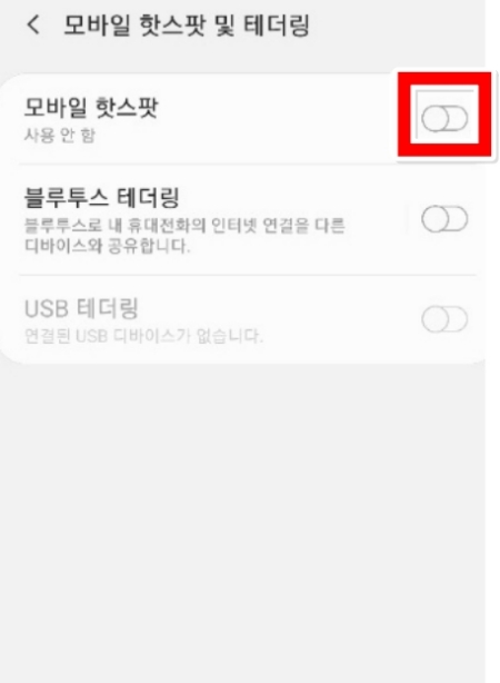 4. '모바일 핫스팟' 항목 오른쪽에 있는 활성화 스위치를 눌러 기능을 켜주세요. 스위치를 켜는 것만으로도 주변 기기에서 내 스마트폰이 보이기 시작합니다.