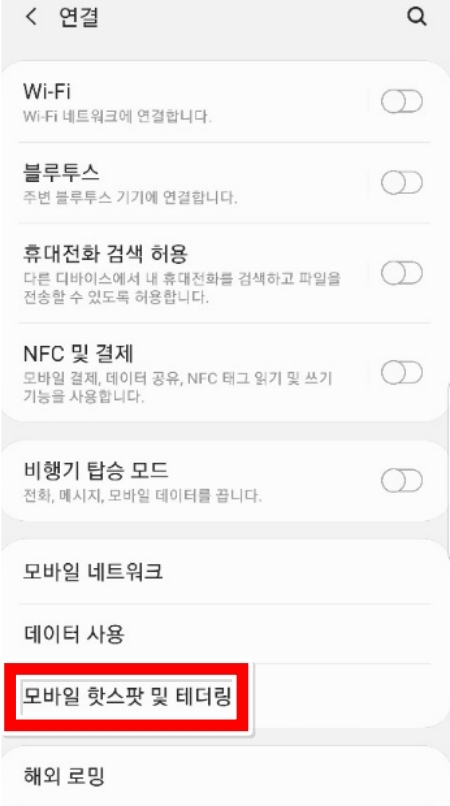 3. 연결 메뉴의 여러 항목 중에서 '모바일 핫스팟 및 테더링'을 선택해 주세요. 이곳에서 내 스마트폰의 인터넷 신호를 다른 기기와 공유하는 설정을 할 수 있습니다.