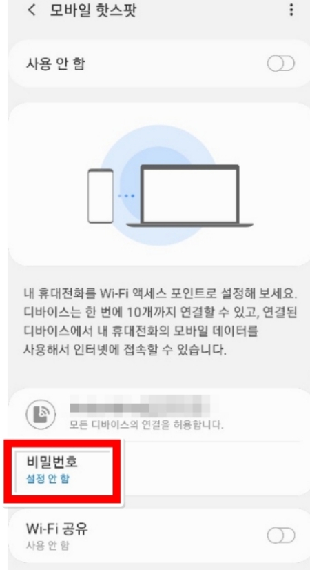 5. 핫스팟을 켠 후에는 '비밀번호' 항목을 눌러 다른 사람이 함부로 접속하지 못하도록 암호를 설정하는 것이 좋습니다. 나만 아는 번호로 안전하게 이용해 보세요.