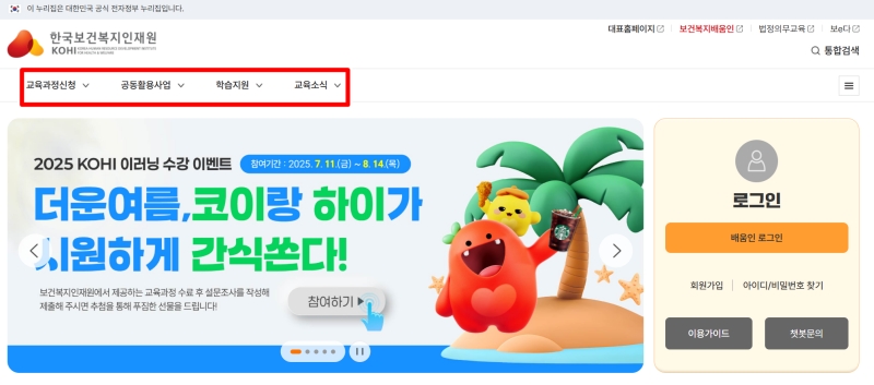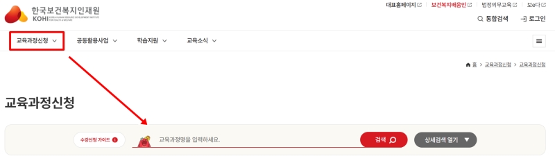 한국보건복지 인재원 온라인 교육 홈페이지