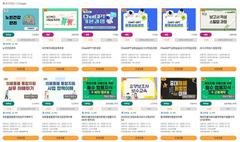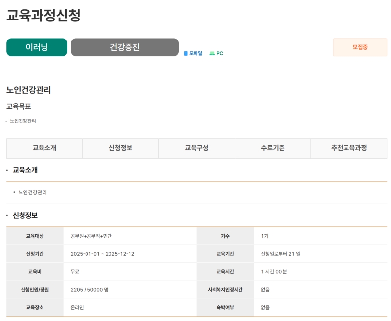 3. 현재 신청할 수 있는 다양한 교육 과정의 목록을 한눈에 볼 수 있어요. 노인 건강 관리, 디지털 활용법 등 여러 주제의 강의들이 준비되어 있으니, 천천히 둘러보며 자신에게 필요한 지식이 무엇인지 찾아보는 시간을 가질 수 있습니다.