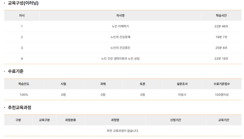 5. 교육이 어떻게 구성되어 있는지도 미리 확인할 수 있어요. 각 차시별 학습 내용과 시간, 그리고 과정을 수료하기 위한 기준까지 명확하게 제시되어 있어 체계적인 학습 계획을 세우는 데 도움이 됩니다.