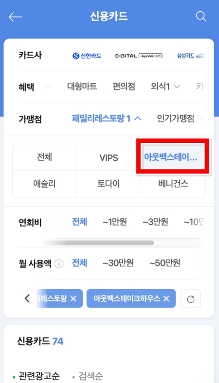 4. 이제 '가맹점' 항목에서 할인받고 싶은 패밀리레스토랑의 이름을 직접 고를 차례입니다. 여러 레스토랑 이름 중에서 '아웃백스테이크하우스'를 찾아서 선택하면, 해당 가맹점에서 혜택을 주는 카드만 추려집니다.