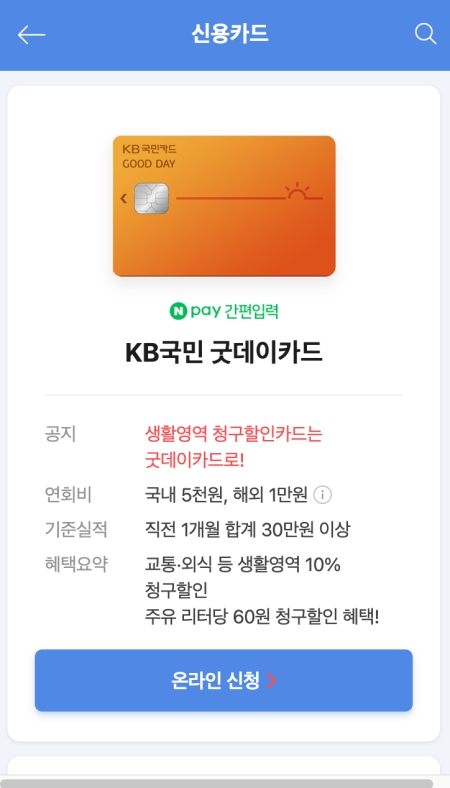 6. 여러 카드 중에서 'KB국민 굿데이카드'처럼 마음에 드는 카드 하나를 선택하면, 해당 카드의 연회비나 전월 실적 조건, 그리고 주요 혜택 요약과 같은 상세한 정보를 자세히 확인할 수 있습니다.