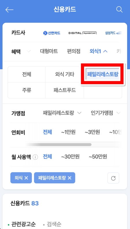 3. 외식 혜택 중에서도 조금 더 구체적인 조건을 설정하기 위해 '패밀리레스토랑' 항목을 선택해 주세요. 이렇게 하면 수많은 외식 가맹점 중에서 우리가 원하는 곳을 더 빠르고 정확하게 찾을 수 있습니다.