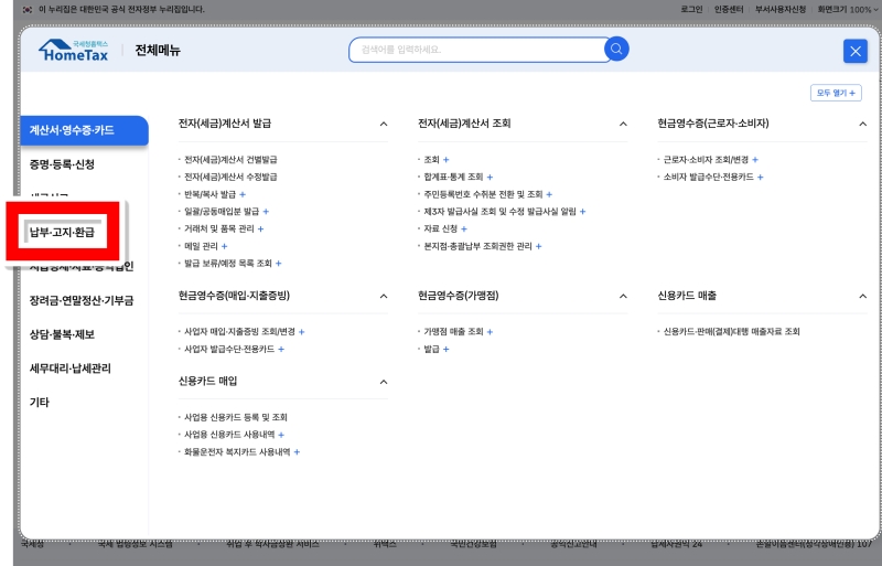 2. 전체 메뉴 화면이 열리면 다양한 항목들이 보입니다. 그중에서 세금의 납부, 고지, 환급과 관련된 업무를 처리할 수 있는 '납부·고지·환급' 메뉴를 찾아서 선택해 주세요.