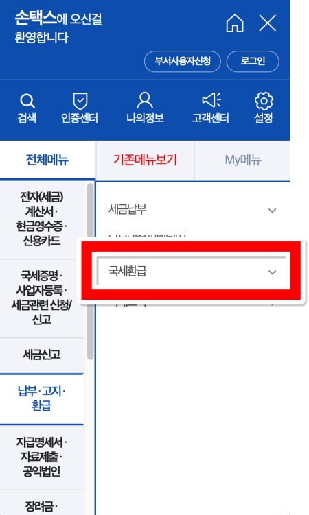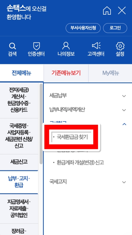 8. 여러 세부 메뉴 중에서 '국세환급금'이라고 적힌 부분을 선택해 주세요. 이어서 바로 아래에 나타나는 하위 메뉴로 이동하여 다음 단계를 진행합니다.